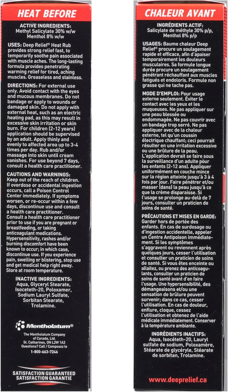 - DEEP RELIEF® Maximum Strength Heat Rub provides maximum strength soothing warm relief on contact. Formulated with both Methyl Salicylate and Menthol, it penetrates deep to relieve pain to get you moving again. This long-lasting formula provides penetrating warm pain relief for sore, aching muscles.
