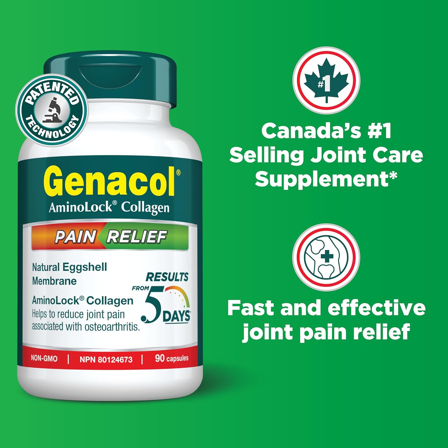 - Genacolยฎ Pain Relief combines exclusive ultra-hydrolyzed AminoLockยฎ Collagen with Natural Eggshell Membrane. Together, these natural ingredients help to reduce joint pain associated with osteoarthritis in 5 days!