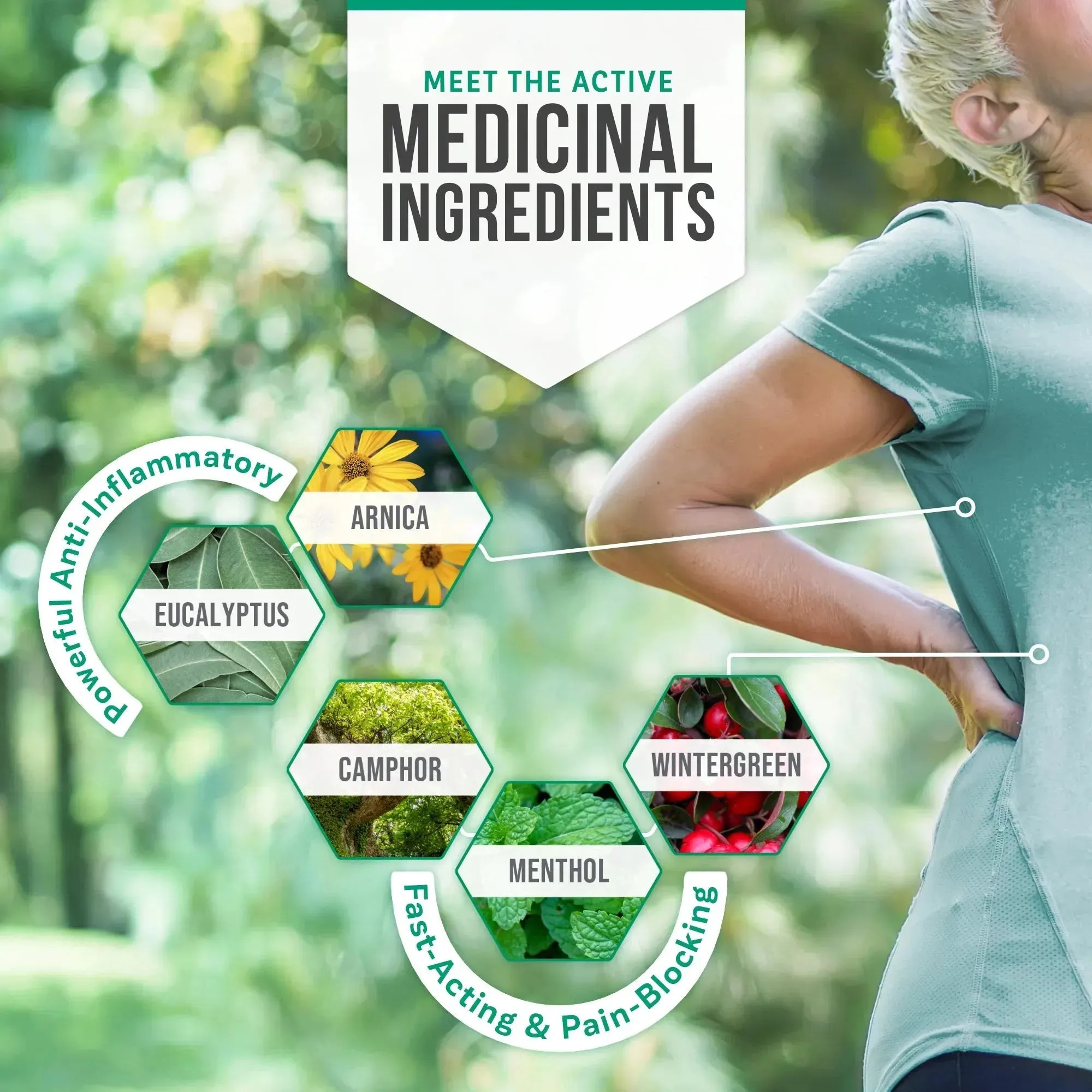 • Formulated with proven, natural active, pain-blocking and anti-inflammatory ingredients including Arnica, Eucalyptus, Menthol, Methyl Salicylate, and Camphor.