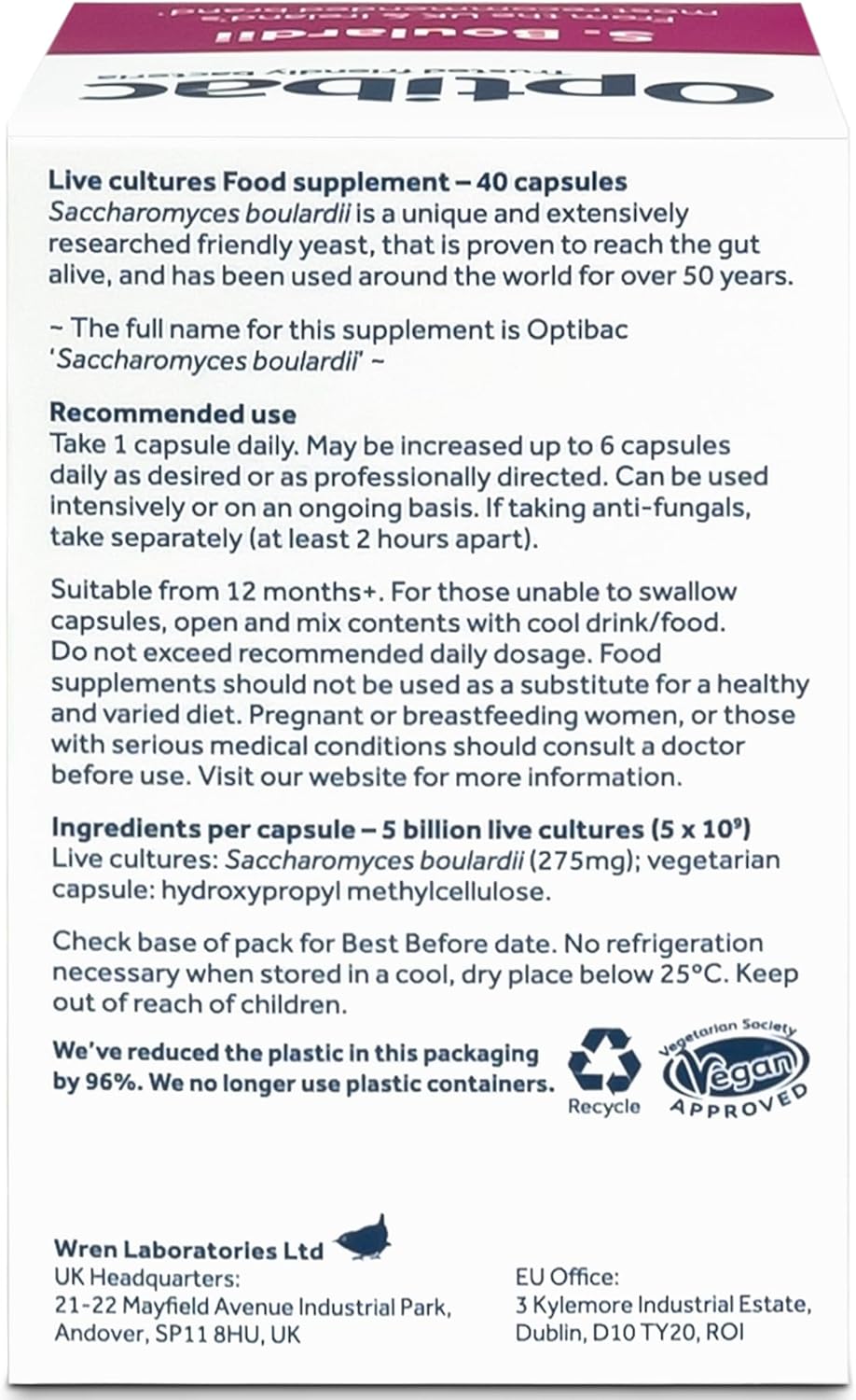 - “Nourish your gut naturally with Optibac Probiotics Saccharomyces Boulardii. Each easy-to-swallow capsule delivers 5 billion scientifically guaranteed live cultures of this internationally recognized probiotic, proven to thrive in your digestive system. We believe in purity: our vegan, dairy-free, gluten-free, and sugar-free formula is free from artificial additives, ensuring a clean and natural path to digestive balance. Suitable for women, men, and children over 1 year, Optibac Saccharomyces Boulardii is the simple, effective choice for long-term gut health support.”